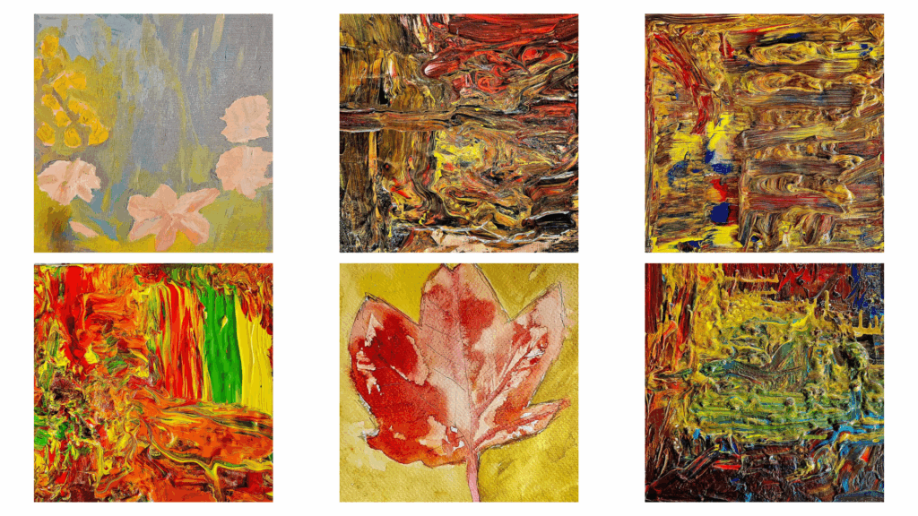 Certaines toiles évoquent les pays chauds, leurs marchés, leurs couchers de soleil, leur énergie lumineuse. D’autres sont plus paisibles, inspirées par la nature suisse, ses fleurs fragiles, ses forêts, ses feuilles d’automne qui capturent la douceur du temps qui passe.