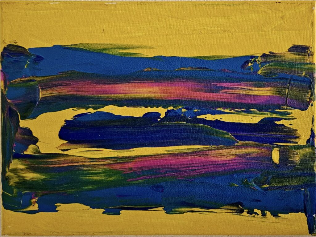 Happy est une toile lumineuse, construite sur un fond jaune intense traversé de bandes de bleu, rose et vert. Les couleurs se mélangent, se superposent et semblent glisser, comme un ciel abstrait un jour de fête. C’est une œuvre joyeuse et directe, pensée pour illuminer un salon, un bureau ou une chambre créative