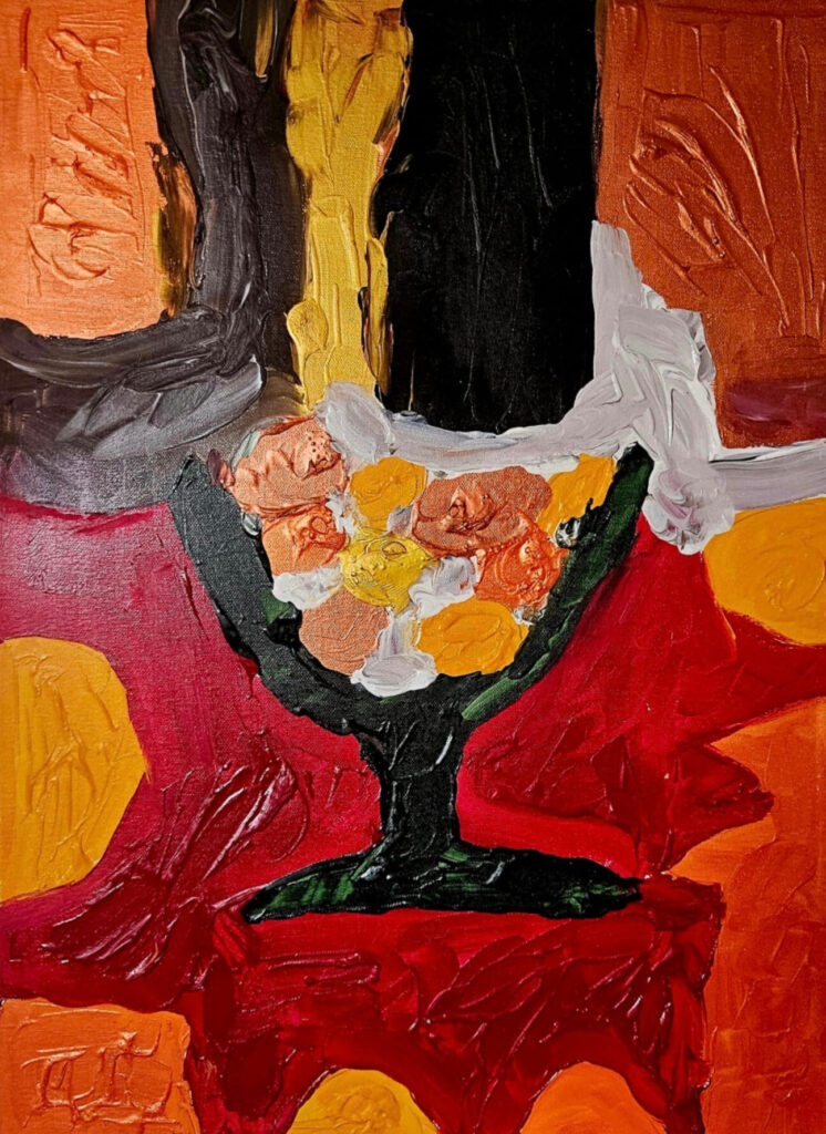 FRUIT BOWL revisite le thème classique de la nature morte en version contemporaine, grâce à une palette chaude de rouges, d’oranges et de jaunes. Le bol sombre qui porte les fruits tranche avec le fond vibrant, mettant en valeur la matière généreuse et les reliefs de peinture. Cette œuvre apporte immédiatement une sensation de convivialité et de chaleur dans la pièce où elle est exposée.